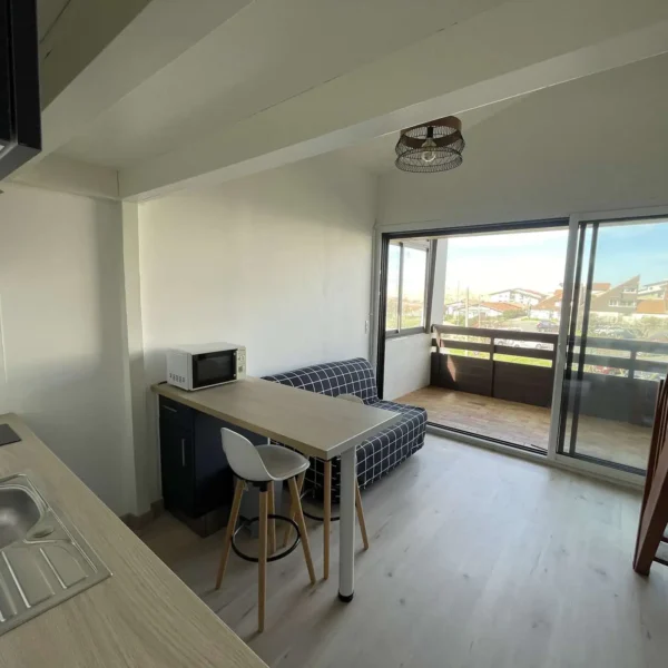 Réf 594 Seignosse le Penon , Résidence Le GRAND LARGE, dans une résidence sans asenceur. charmant STUDIO MEZZANINE au 2ème étage avec aperçu Mer à 200 m de la Plage principale, 50m des petits commerces du Penon. Idéal pour un couple ou une personne seule. Entrée desservant : Séjour lumineux avec TV suspendue, canapé non convertible , grande baies vitrées coulissantes ouvrant sur Terrasse de 6,50 m2 Nord Ouest avec aperçu mer. Cuisinette équipée avec 2 plaques vitro, réfrigérateur, micro-ondes, cafetière senseo, table comptoir avec 2 chaises de bar Escalier meunier desservant une mezzanine entre 1.58m au plus haut et 0,68m au plus bas avec un lit 140, table de chevet. Salle d'eau avec cabine de douche, lavabo avec meuble de rangement, wc. Animaux non admis.Linge de maison non fourni. Emplacement parfait pour des vacances en couple, sans prendre la voiture. Hors saison électricité et chauffage en supplément à régler au départ.