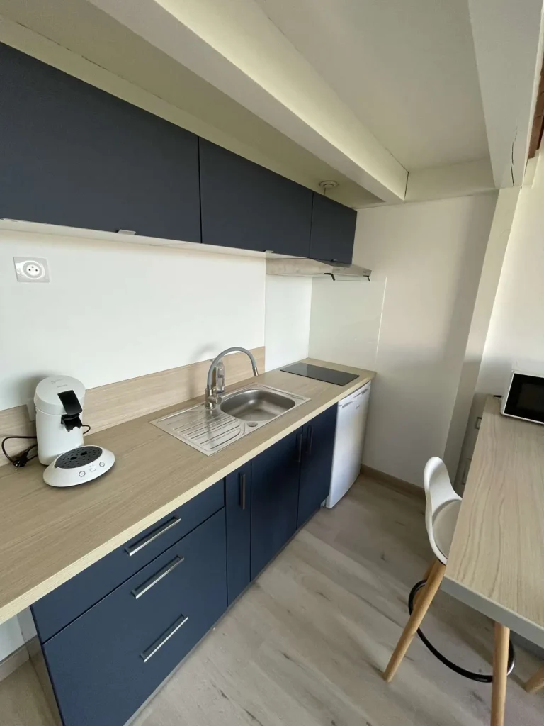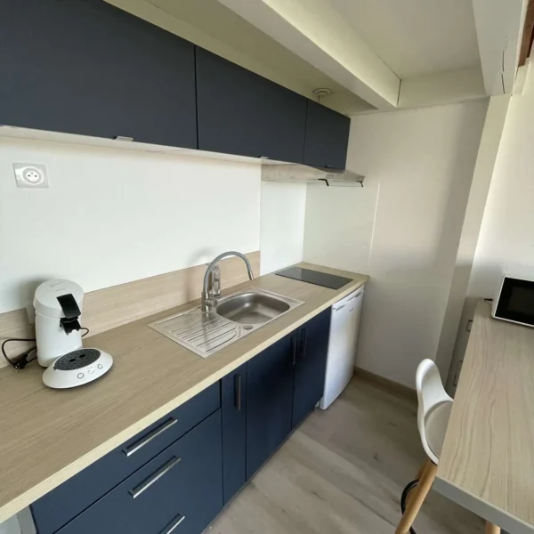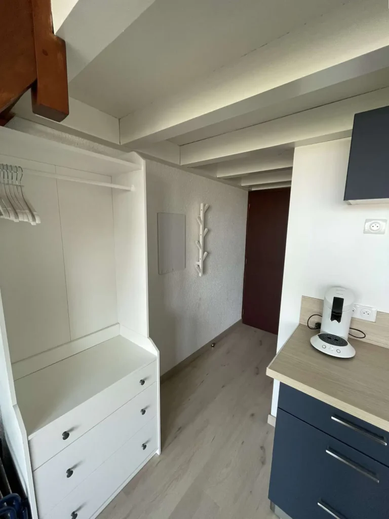 Séjour avec TV,suspendue, canapé non convertible , grande baies vitrées coulissantes ouvrant sur Terrasse de 6,50 m2 Nord Ouest avec aperçu mer. Cuisinette avec 2 plaques vitro, réfrigérateur, micro-ondes, cafetière senseo, table comptoir avec 2 chaises de bar - 14.9 m²