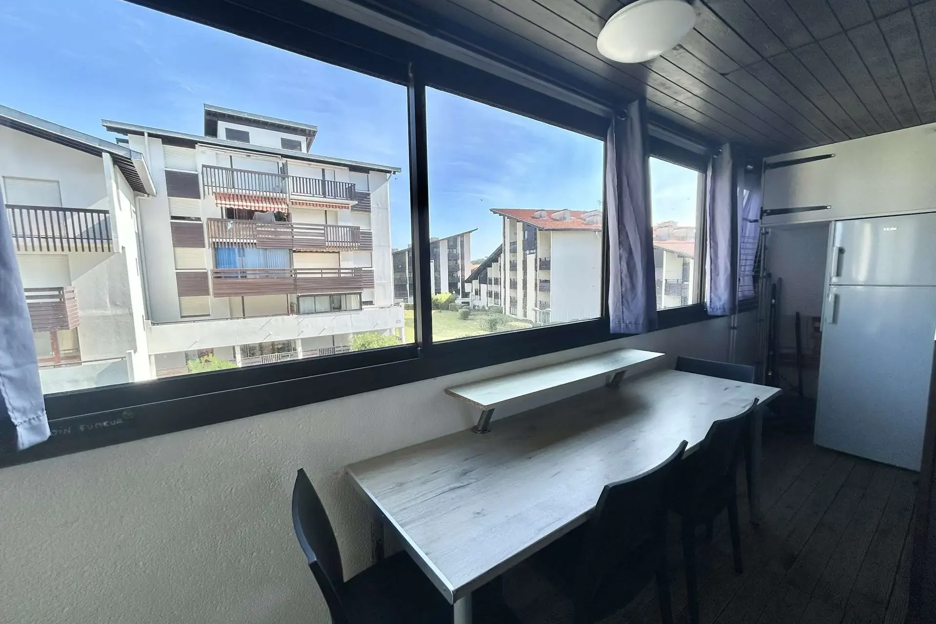 Réf. 539 – Seignosse Le Penon : Appartement T2 avec balcon fermé proche plage et centre Situé au 2ème étage sans asenceur de la résidence DOUC II, cet appartement de 2 pièces se trouve à 150 m de la plage, 100 m du centre commercial et 3500 m du golf. Entrée desservant : - Séjour : canapé lit BZ 2 personnes, table bar et 2 tabourets, TV, porte-fenêtre ouvrant sur balcon Nord - Chambre avec un lit 140 et TV murale - Coin cuisine équipé d'une plaque avec 2 feux, une hotte, micro-ondes, petit four, lave-linge et lave vaisselle - Salle d'eau avec une douche à l'italienne, lavabo et WC - Balcon fermé en véranda, avec réfrigérateur Animaux de petite taille ( max 10kg) uniquement admis sur demande. Chat non admis. Linge de maison non fourni.Petit local vélo commun à la résidence. Non accessible pour les personnes à mobilité réduite. Hors saison, prévoir supplément chauffage et électricité.