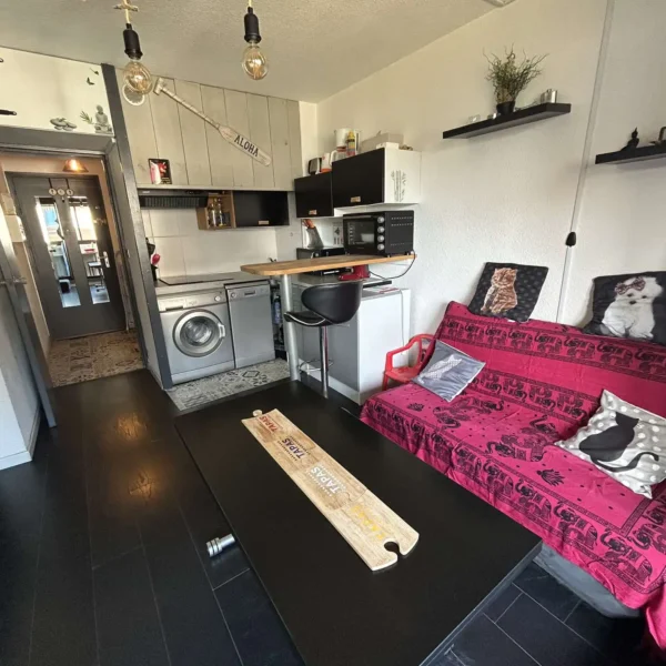 un canapé lit BZ 2 personnes table bar et 2 tabourets, TV, porte-fenêtre ouvrant sur balcon Nord - 12 m² - Kitchenette