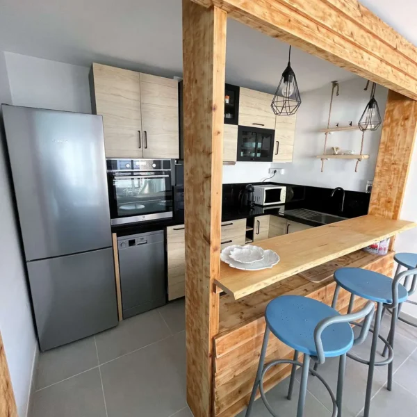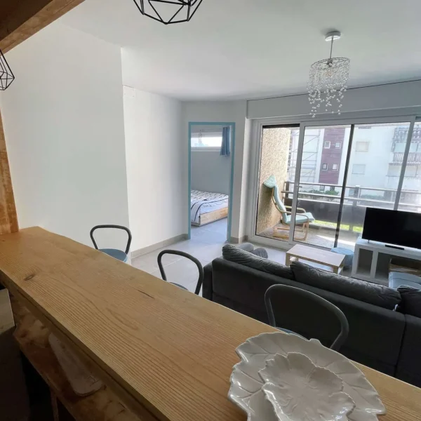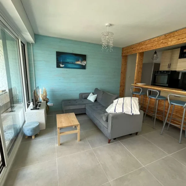 Séjour avec canapé-lit convertible pour 1 personne , rangement, TV écran plat, porte-fenêtre ouvrant sur Loggia Ouest de 4,36m3. Belle cuisine ouverte équipée : plaques vitrocéramiques 4 feux , four, micro-ondes, lave-vaisselle , réfrigérateur/ congélateur , rangements , comptoir et tabourets - 15 m² - Chambre