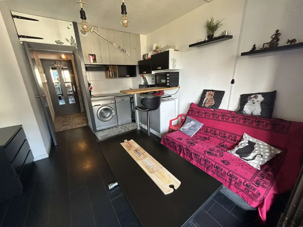 un canapé lit BZ 2 personnes table bar et 2 tabourets, TV, porte-fenêtre ouvrant sur balcon Nord - 12 m² - Kitchenette