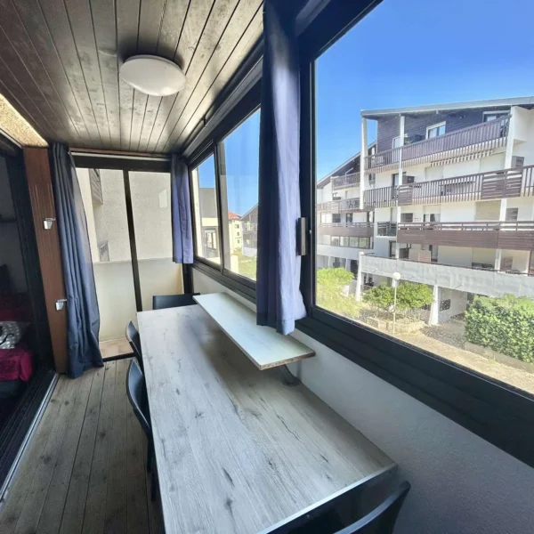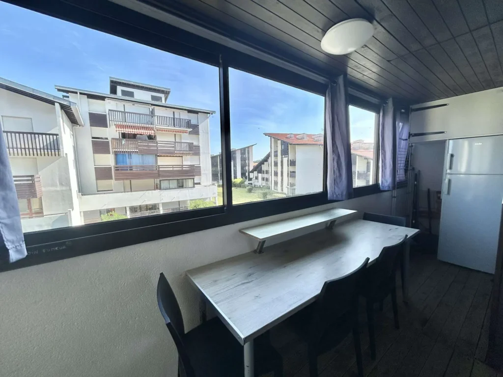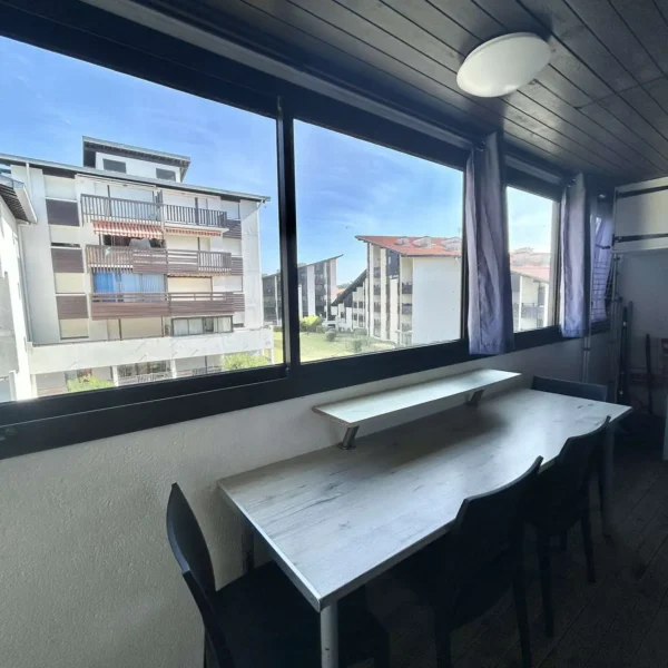Réf. 539 – Seignosse Le Penon : Appartement T2 avec balcon fermé proche plage et centre Situé au 2ème étage sans asenceur de la résidence DOUC II, cet appartement de 2 pièces se trouve à 150 m de la plage, 100 m du centre commercial et 3500 m du golf. Entrée desservant : - Séjour : canapé lit BZ 2 personnes, table bar et 2 tabourets, TV, porte-fenêtre ouvrant sur balcon Nord - Chambre avec un lit 140 et TV murale - Coin cuisine équipé d'une plaque avec 2 feux, une hotte, micro-ondes, petit four, lave-linge et lave vaisselle - Salle d'eau avec une douche à l'italienne, lavabo et WC - Balcon fermé en véranda, avec réfrigérateur et partie congélateur Animaux de petite taille ( max 10kg) uniquement admis sur demande. Chat non admis. Linge de maison non fourni.Petit local vélo commun à la résidence. Non accessible pour les personnes à mobilité réduite. Hors saison, prévoir supplément chauffage et électricité.