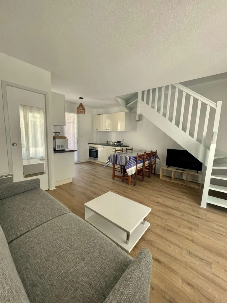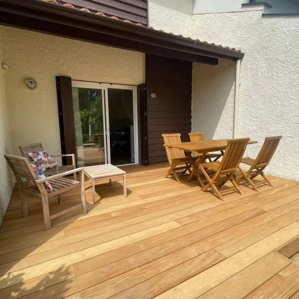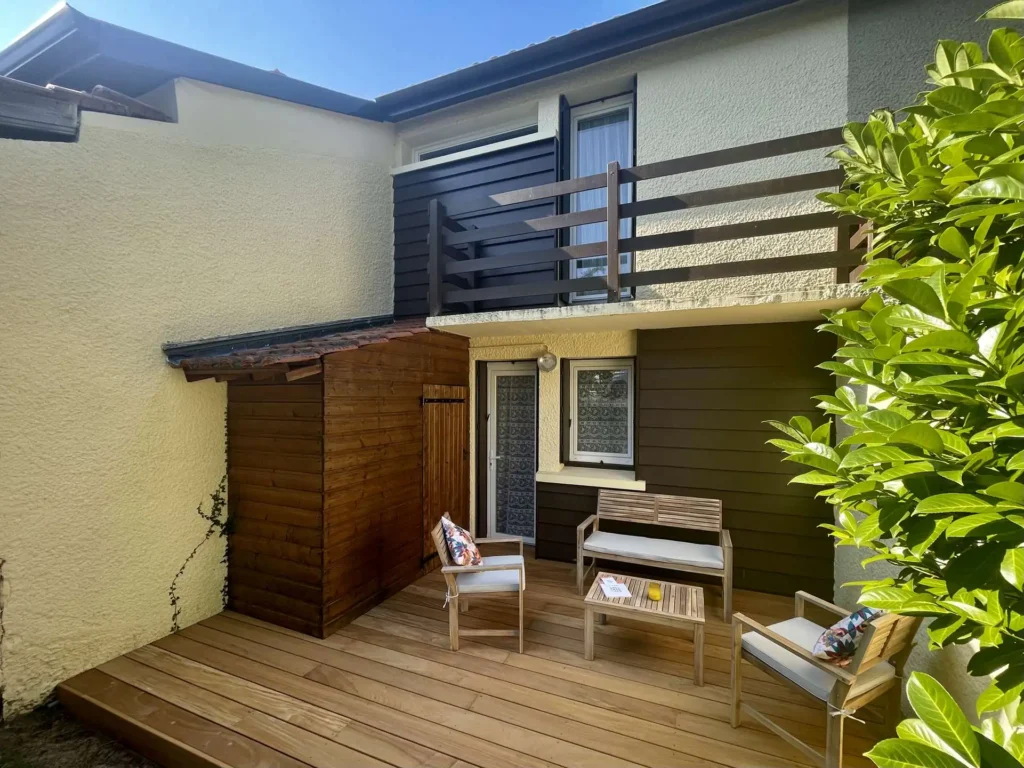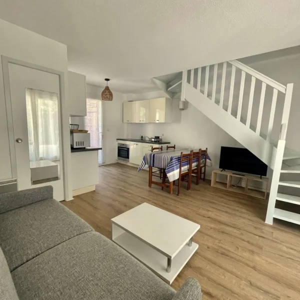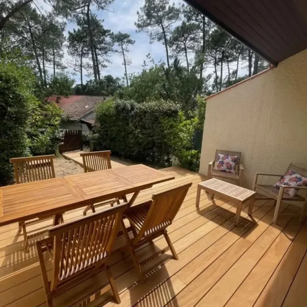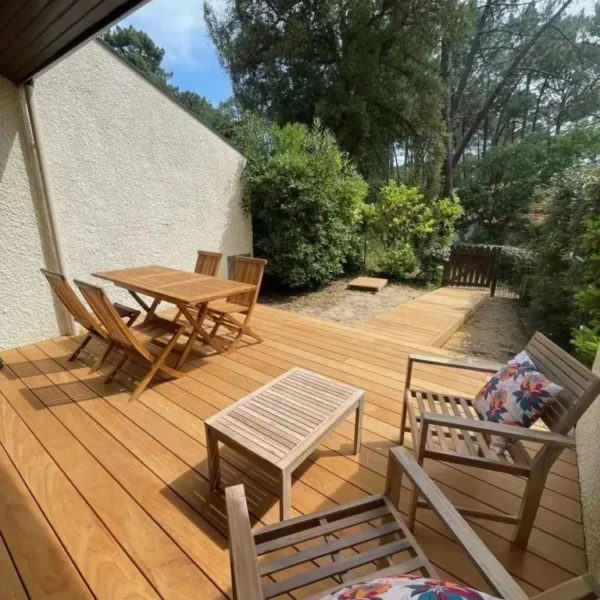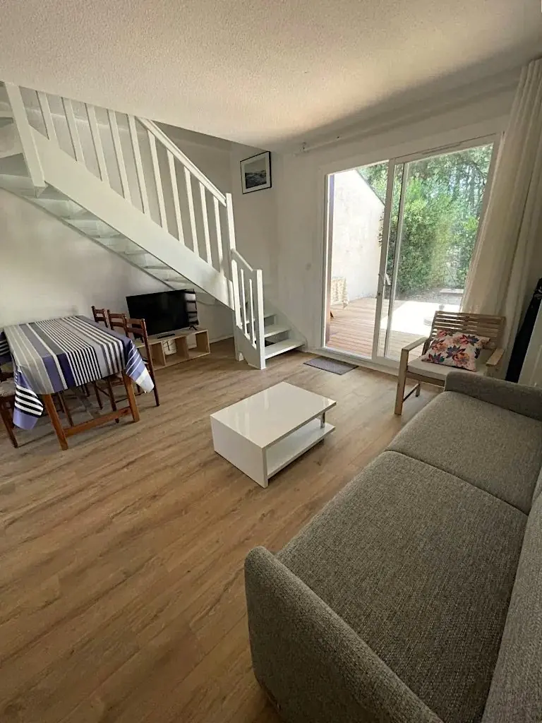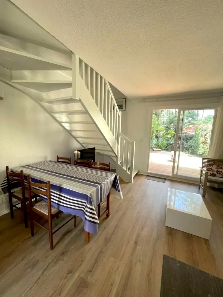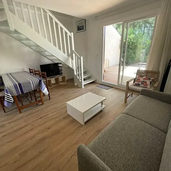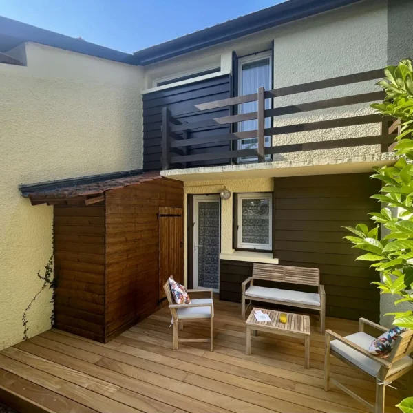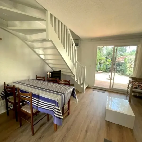 Réf 213 LES OCEANIDES, Seignosse Le Penon, classée 2** Au calme dans un hameau sous les pins, Villa patio de 50m2 traversante Sud/Nord. Vous apprécierez le calme et la tranquillité des lieux. Plage accessible à pied, l'océan est à deux pas. Situation idéale pour se ressourcer et savourer l’ambiance estivale. Sentiers de randonnées en forêt balisés. Séjour avec canapé de 2 personnes, baie vitrée double vitrage ouvrant sur belle terrasse Sud de 20 m2 et jardinet. Cuisine équipée ouverte sur séjour : plaque induction 3 feux, four électrique, réfrigérateur, micro-ondes, rangements. Porte-fenêtre ouvrant sur terrasse Nord de 12 m2. Dégagement, rangement, lave-linge, WC indépendant. A l'étage : Chambre 1 : 1 lit 140 cm, petits rangements, porte-fenêtre sur balcon. Chambre 2 : 2 lits 90 cm, armoire de rangement, fenêtre. Salle d’eau : cabine de douche, vasque, fenêtre haute et VMC. Animaux non admis. Linge de maison non fourni. Non accessible pour les personnes à mobilité réduite. Hors saison électricité et chauffage en supplément à régler au départ. Le + : 2 belles terrasses en bois pour vos repas en plein air, vos apéros au coucher du soleil ou vos moments de farniente.