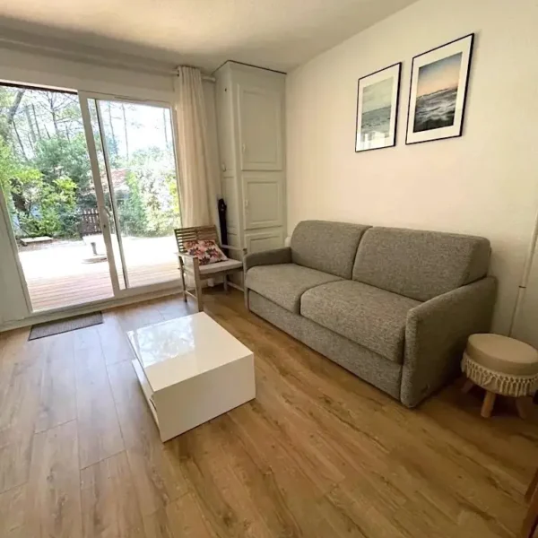 Séjour avec canapé lit 1 personne, TV, porte-fenêtre ouvrant sur jardinet et Terrasse Sud, - 18 m² - Chambre 1