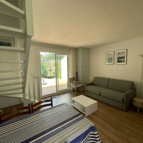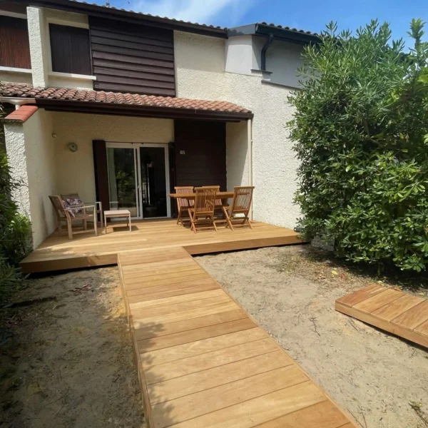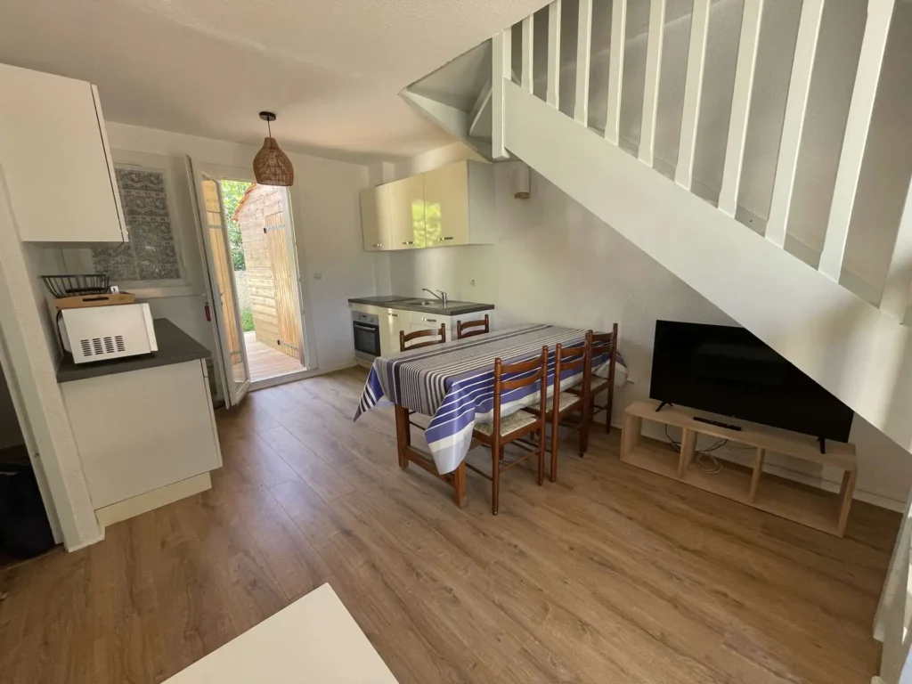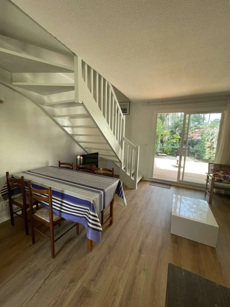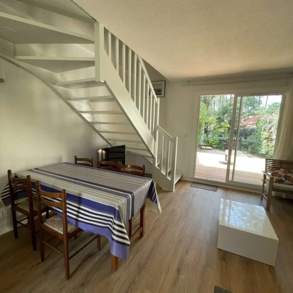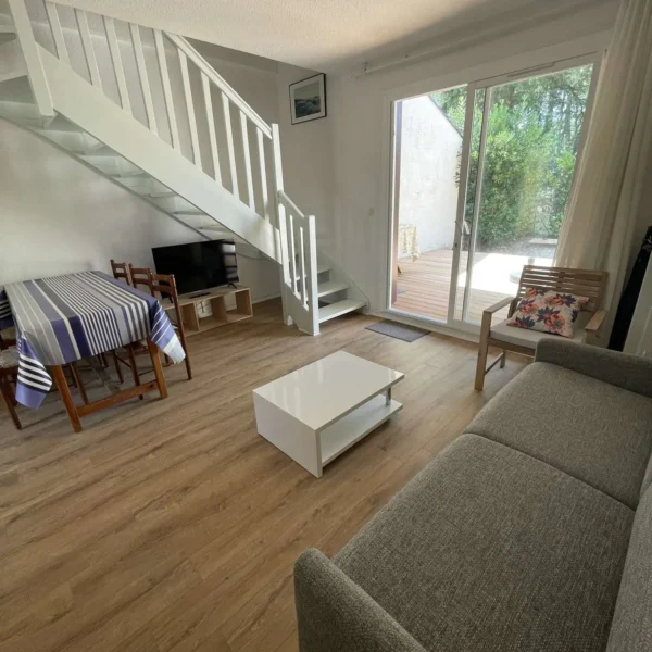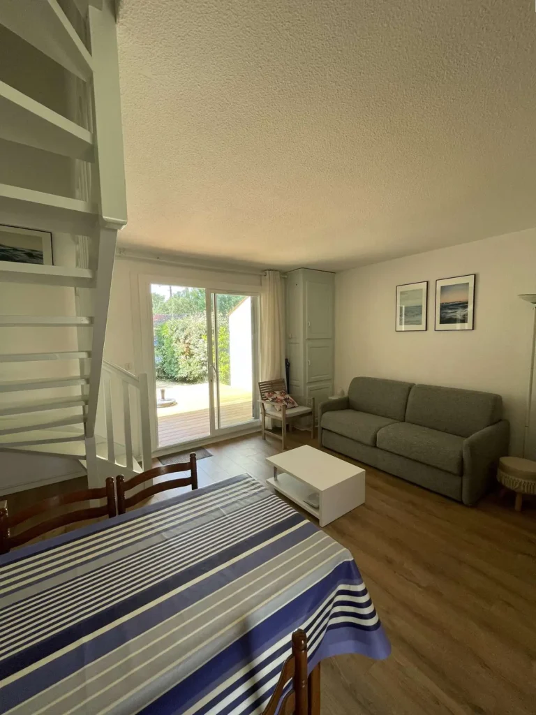 Réf 213 : Seignosse Le Penon, LES OCEANIDES, classée 2*. Située au calme dans un hameau sous les pins, villa patio de 50m2 traversante Sud/Nord. Vous apprécierez le calme et la tranquillité de ce hameau. Plage accessible à pieds, plus besoin de voiture, l'océan est à deux pas. Situation idéale pour se ressourcer et savourer l’ambiance estivale. Séjour avec canapé neuf 2025 pour 1 personne, une TV, porte-fenêtre ouvrant sur jardinet et belle terrasse exposée Sud. Cuisine équipée ouverte sur séjour : plaque induction 3 feux, four électrique, réfrigérateur bas, micro-ondes, rangements, porte-fenêtre ouvrant sur terrasse Nord de 12m2. Dégagement, rangement, lave-linge, wc indépendant. A l'étage : Chambre 1 : 1 lit 140, petits rangements, porte-fenêtre sur petit balcon. Chambre 2 : 2 lits 90, armoire et fenêtre. Salle d'eau : une douche, vasque, rangements, fenêtre haute exposée Nord. Animaux non admis. Linge de maison non fourni.Non accessible pour les personnes à mobilité réduite. Hors saison électricité et chauffage en supplément à régler au départ. Le + : 2 belles terrasses neuves 2025 en bois pour vos repas en plein air, vos apéros au coucher du soleil ou vos moments de farniente.