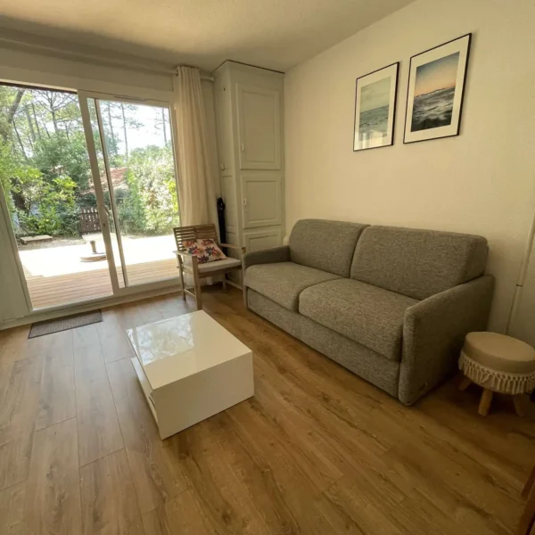 Séjour avec canapé lit 1 personne, TV, porte-fenêtre ouvrant sur jardinet et Terrasse Sud, - 18 m² - Chambre 1