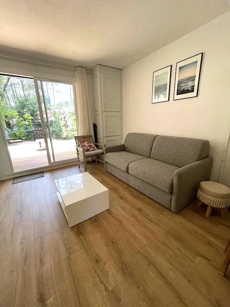 Séjour avec canapé lit 1 personne, TV, porte-fenêtre ouvrant sur jardinet et Terrasse Sud, - 18 m² - Chambre 1